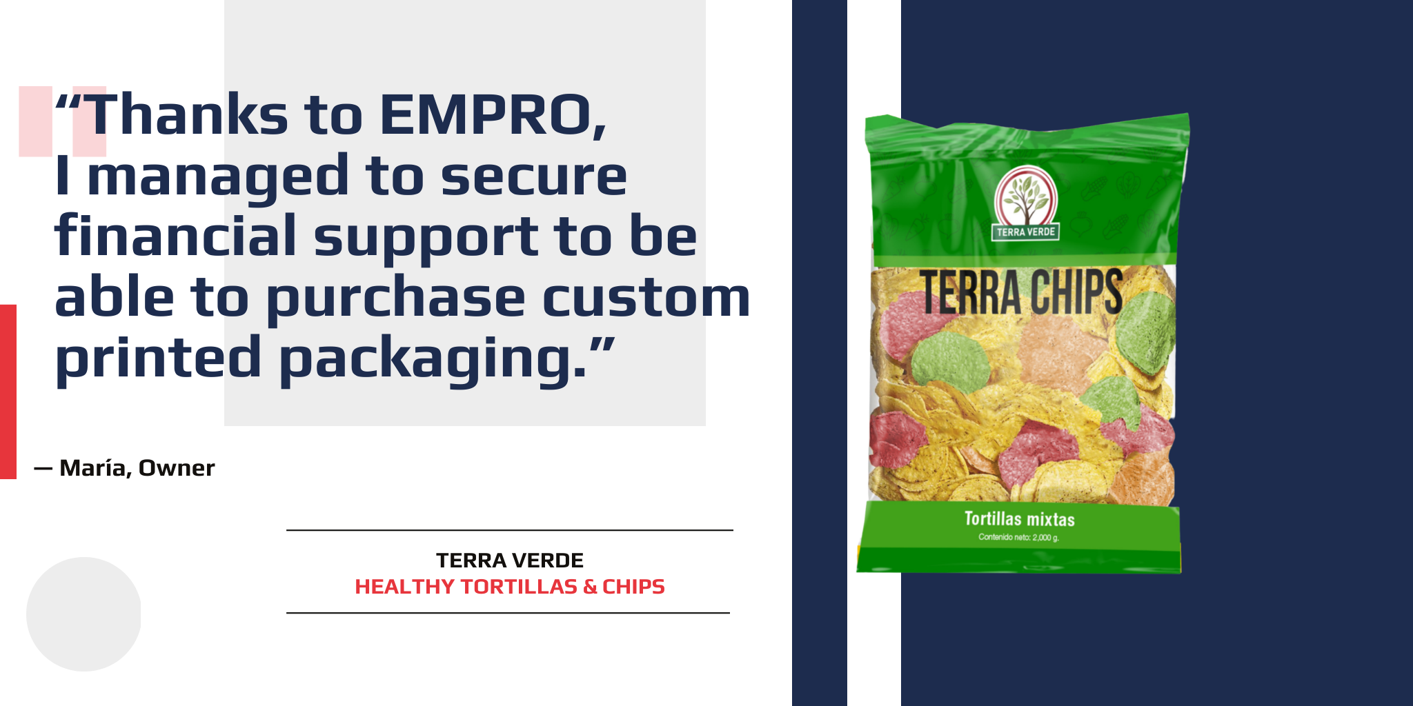 María of Terra Verde, which sells healthy tortillas and chips, stated that the classes allowed her to understand the strengths and weaknesses that she has as a business owner and to identify new market opportunities, strategize for future growth, and strengthen her existing product line. María feels more confident in her management skills, and in her ability to analyze problems and make sound decisions. Her monthly sales increased from US$4,000 at the beginning of the program to US$6,400 by the end. “Thanks to EMPRO, I managed to secure financial support to be able to purchase custom printed packaging.”