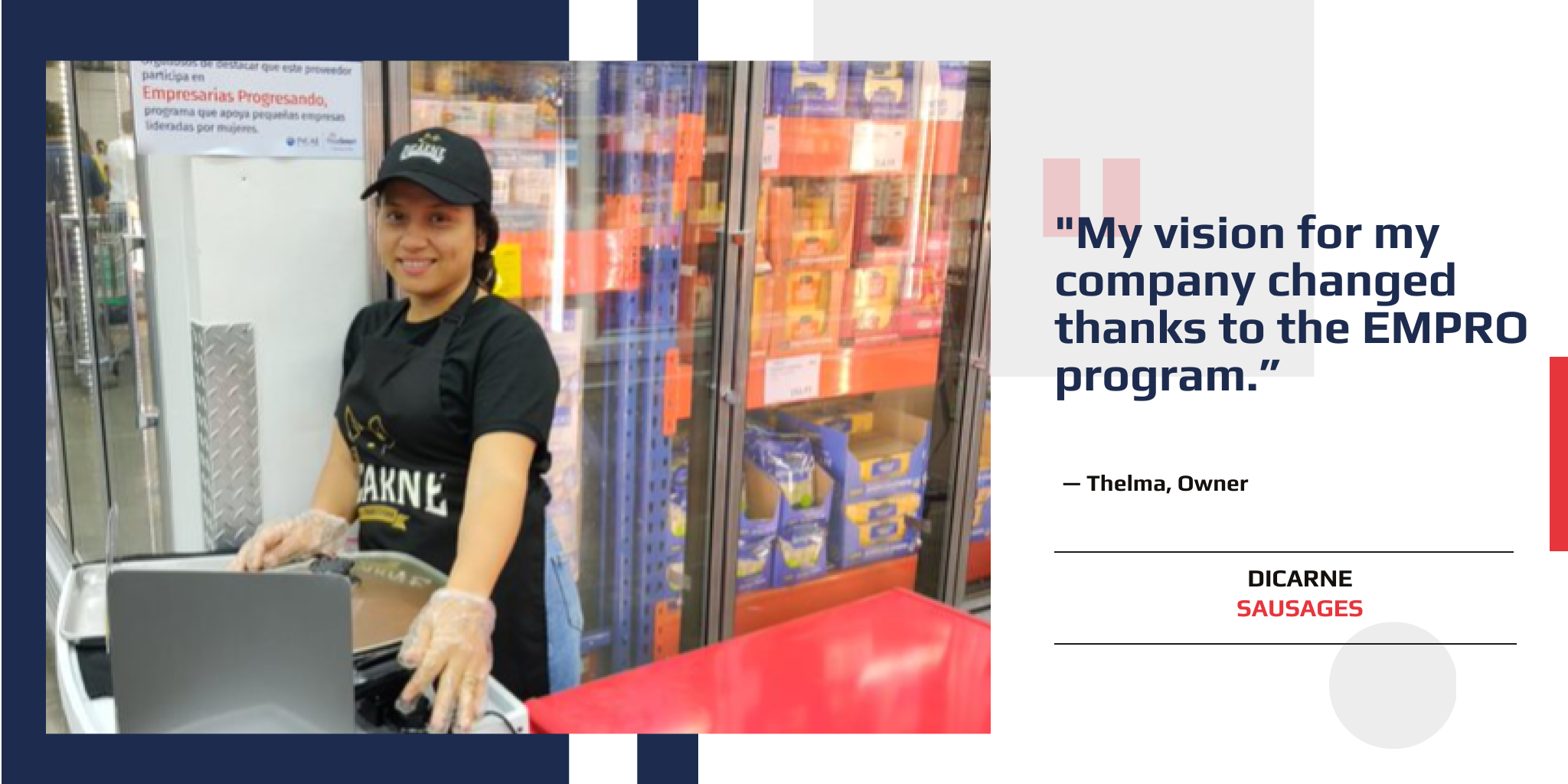 Thelma of DiCarne sausage company said her “vision for her company changed thanks to EMPRO.” The program showed her a “complete vision of the business and how to make decisions to improve the structure, development, and efficiency of [her] operations”. Over the course of the program, Thelma increased her annual sales from US $6,000 to US$14,000 and sold her sausages at PriceSmart as both a Roadshow and as a short-term product vendor!